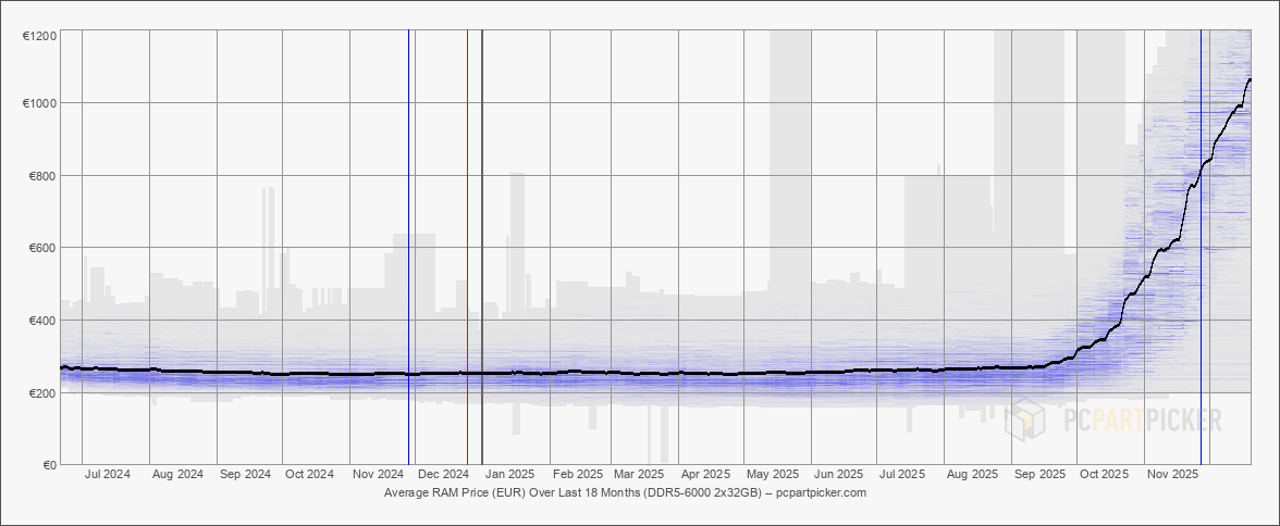 - PCPartPicker, DDR5 64GB kit price trends↑(December 2025)Price trend chart showing high-density DDR5 64GB (2x32GB) kit prices nearly quadrupling from approximately €250-€280 in September 2025 to over €1000 by November 2025. Chart source: https://nl.pcpartpicker.com/trends/price/memory/#ram.ddr5.6000.2x32768